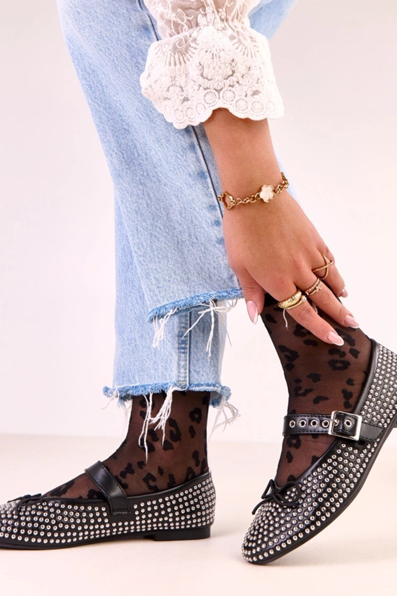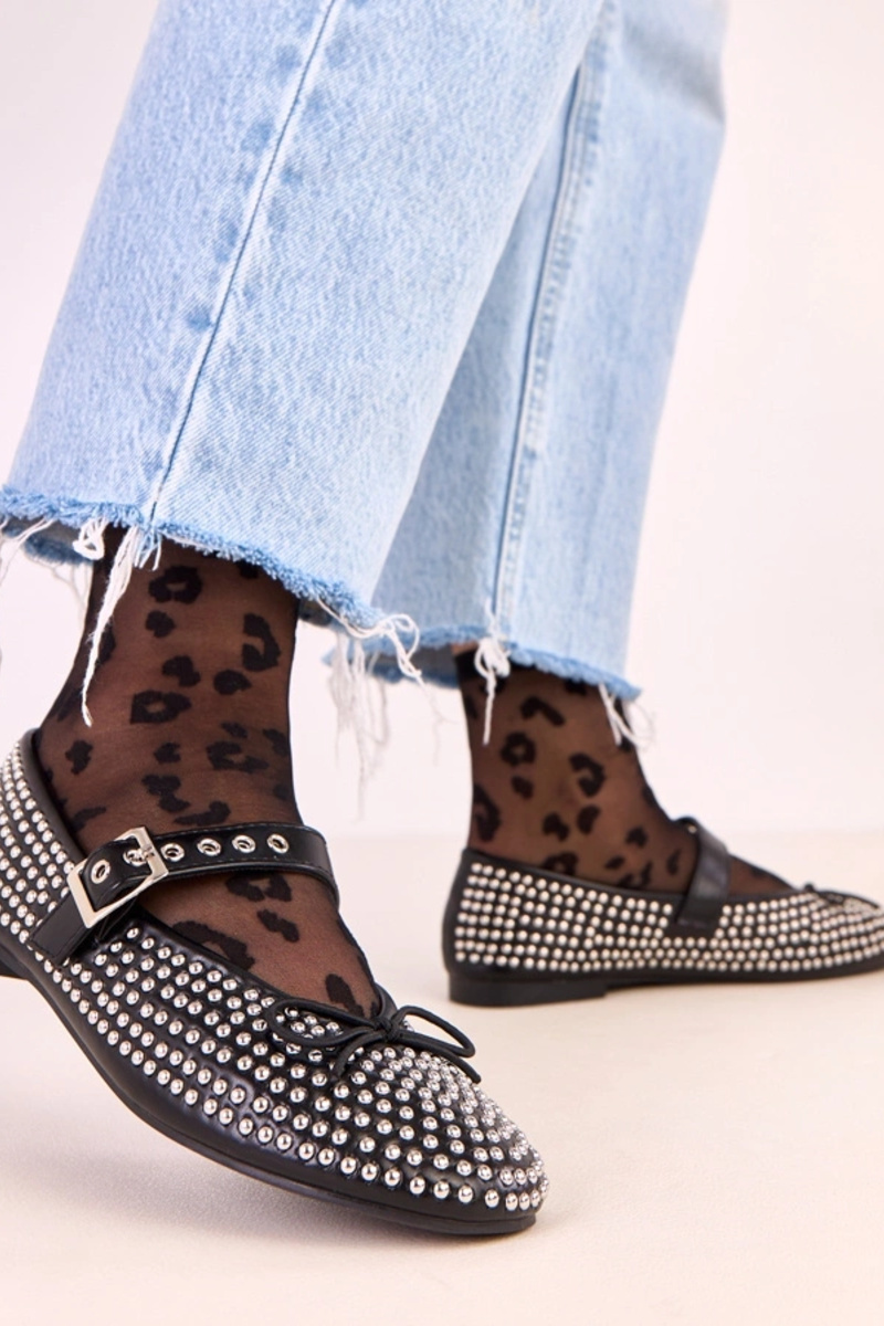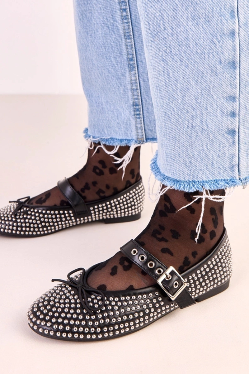 Ballerines Mylie en cuir noir, décorées de clous et de rubans