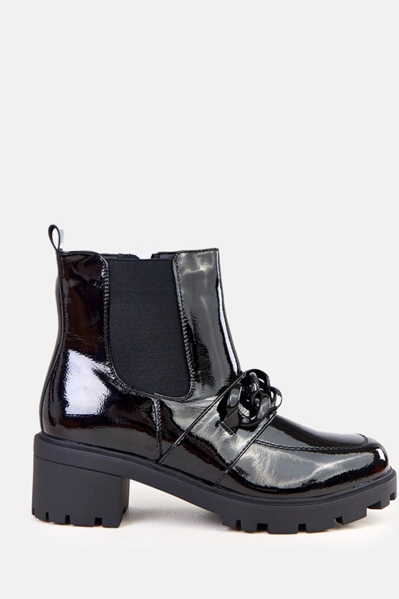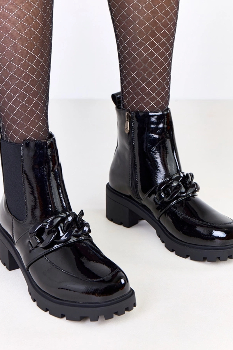 Czarne botki lakierowane zdobione łańcuchem Sentley