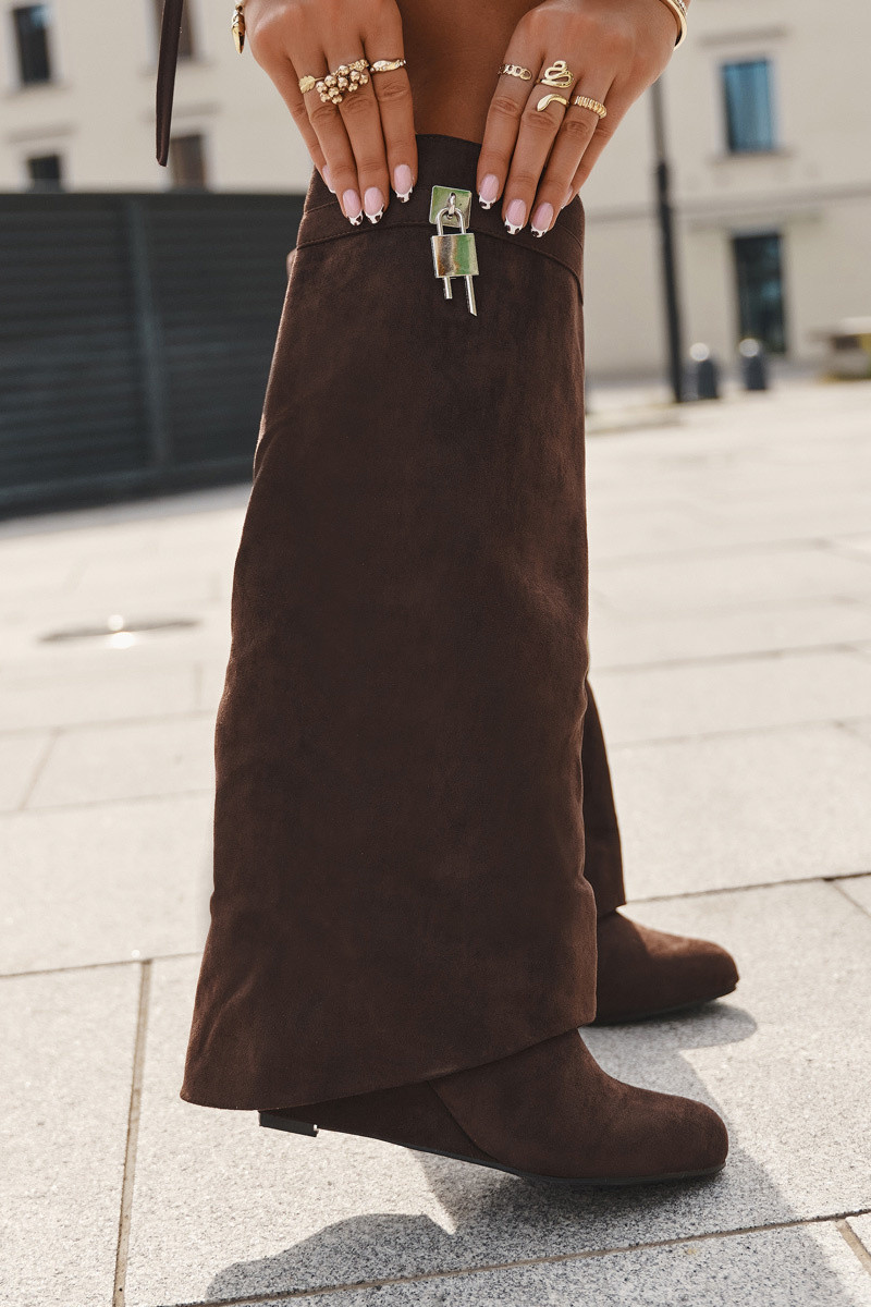 Bottes longues pour femmes sur plateforme avec sangles et détails argentés couleur chocolat Korivelle