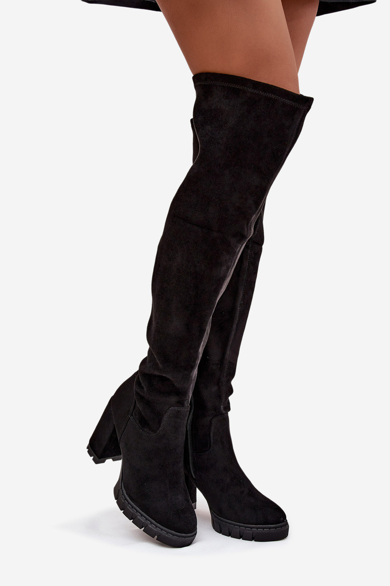 Bottes longues féminines au-dessus du genou avec talons en suède synthétique couleur noire Tahlina