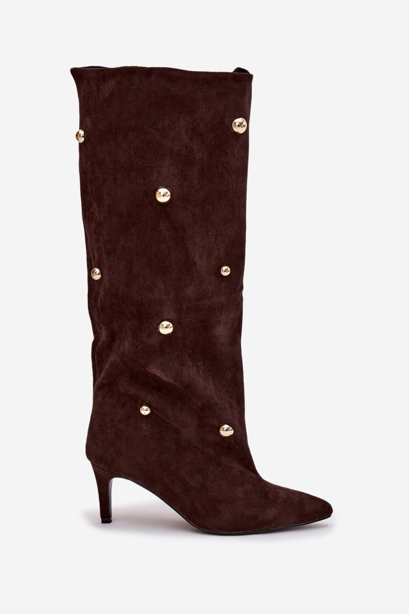 Bottes longues à enfiler chocolat pour femmes avec talons fins et ornements dorés Thaliane