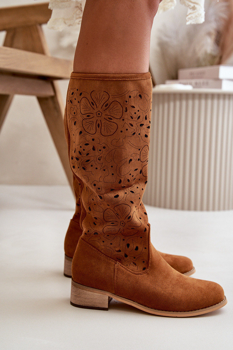 Bottes longues pour femmes avec éléments ajourés à talons bas en daim synthétique marron avec fermeture éclair Orchides