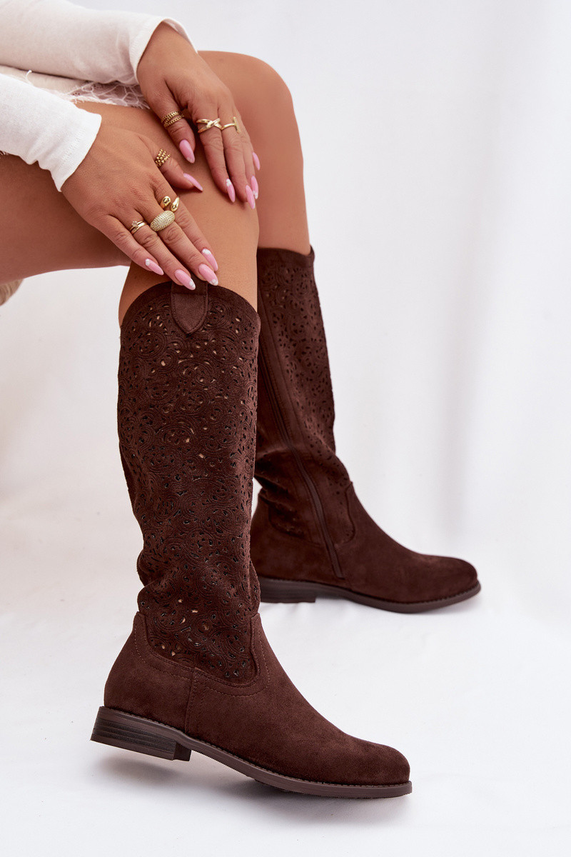 Bottes longues pour femmes avec éléments ajourés et larges talons S.Barski HY61-8023, couleur chocolat