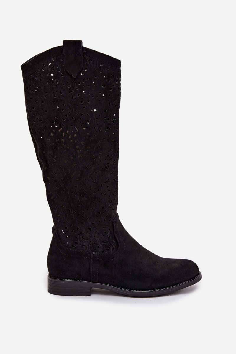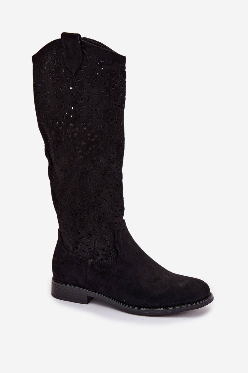 Bottes longues pour femmes avec éléments ajourés et larges talons S.Barski HY61-8023, couleur noire