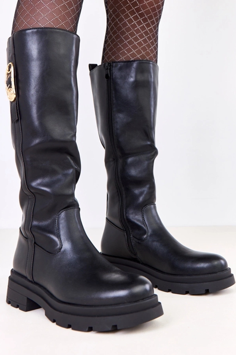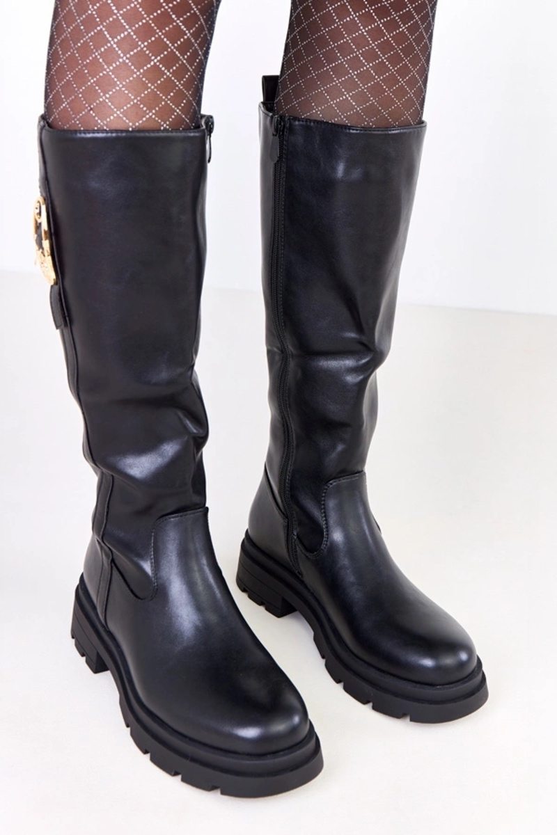 Czarne kozaki z ekoskóry ze złotą ozdobą Meliros