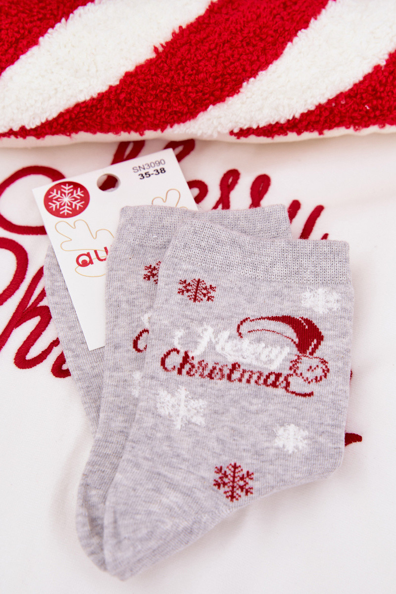 Chaussettes de Noël pour femmes grises avec flocons et inscription