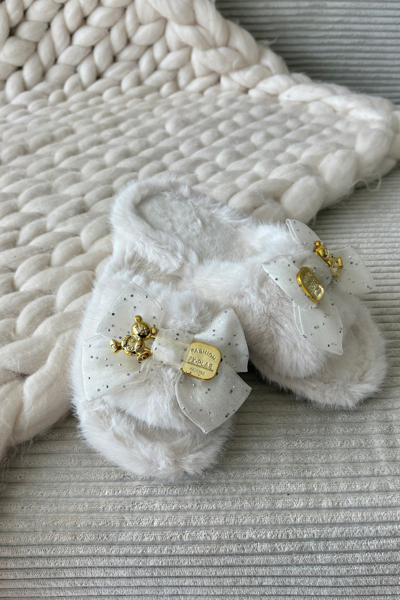 Chaussons pour femmes couleur ivoire avec fourrure, nœuds et décorations dorées « Nolara »