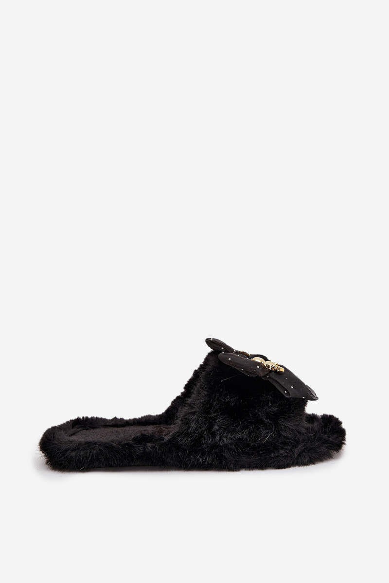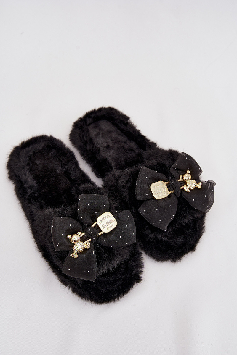 Chaussons pour femmes noires avec fourrure, nœuds et décorations dorées « Nolara »