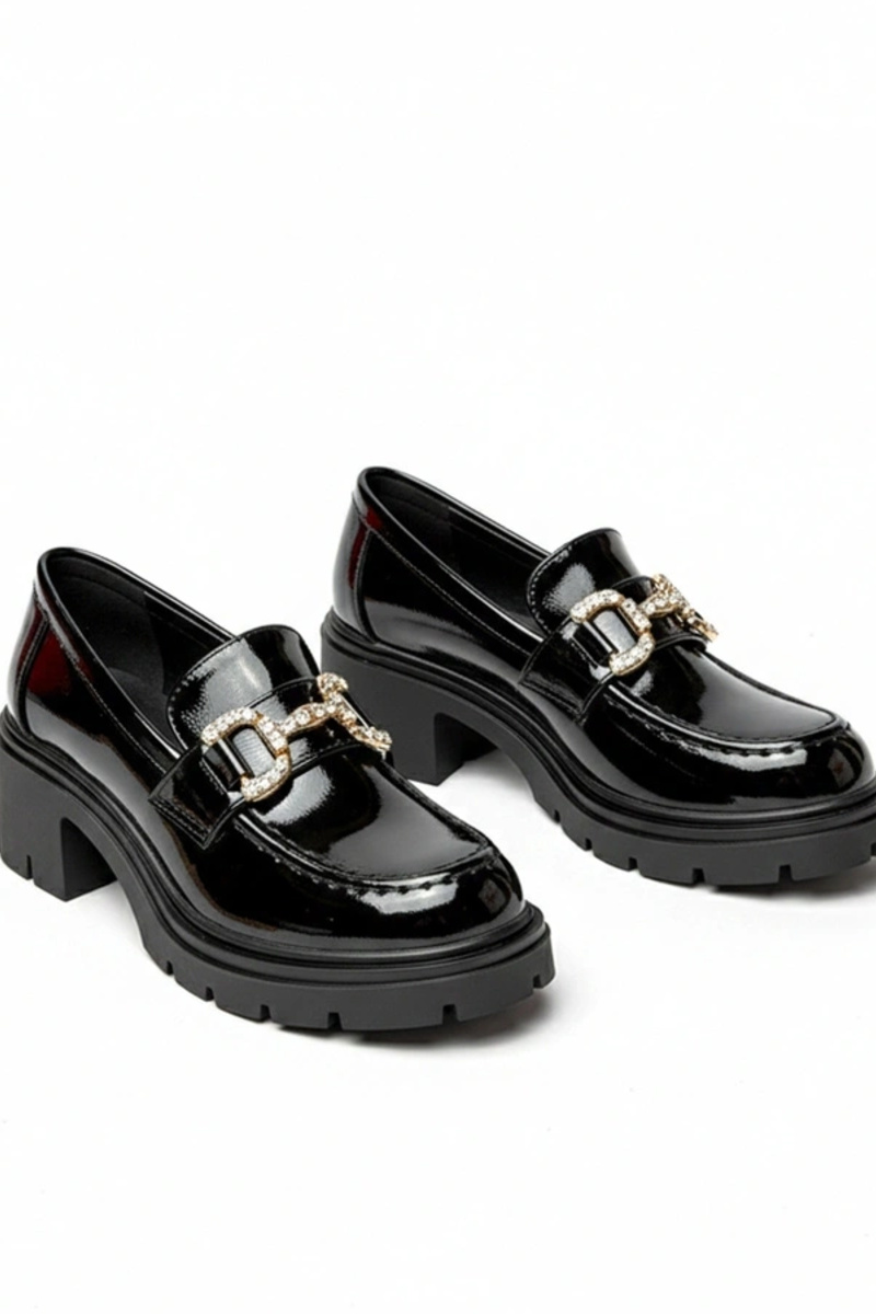 Mocassins noirs laqués avec talon et zirconiums Paola
