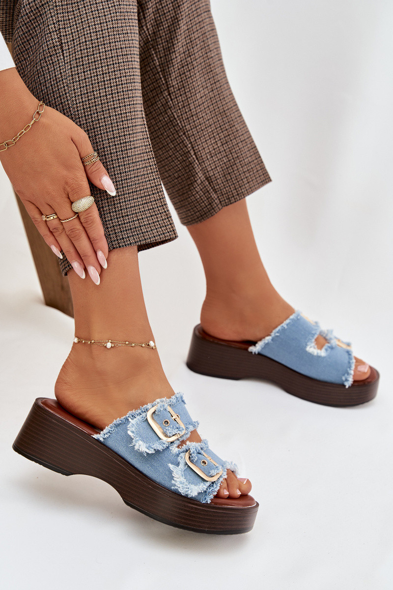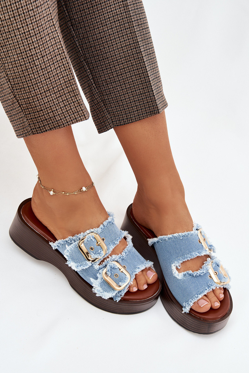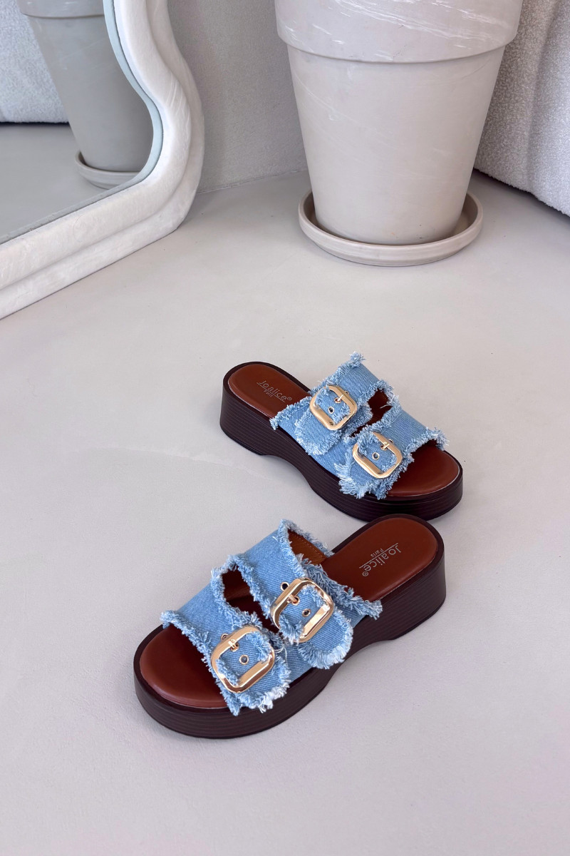 Sandales féminines avec plateforme couleur or et boucles couleur bleue