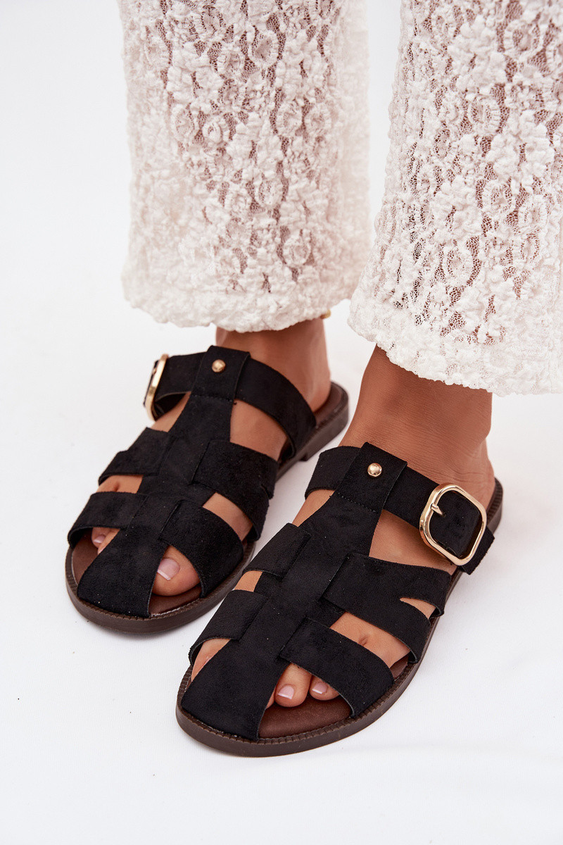 Pantoufles pour femmes avec des talons larges avec des bandes I Złotą avec boucles couleur noire Elzora
