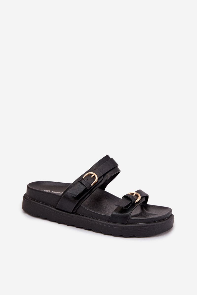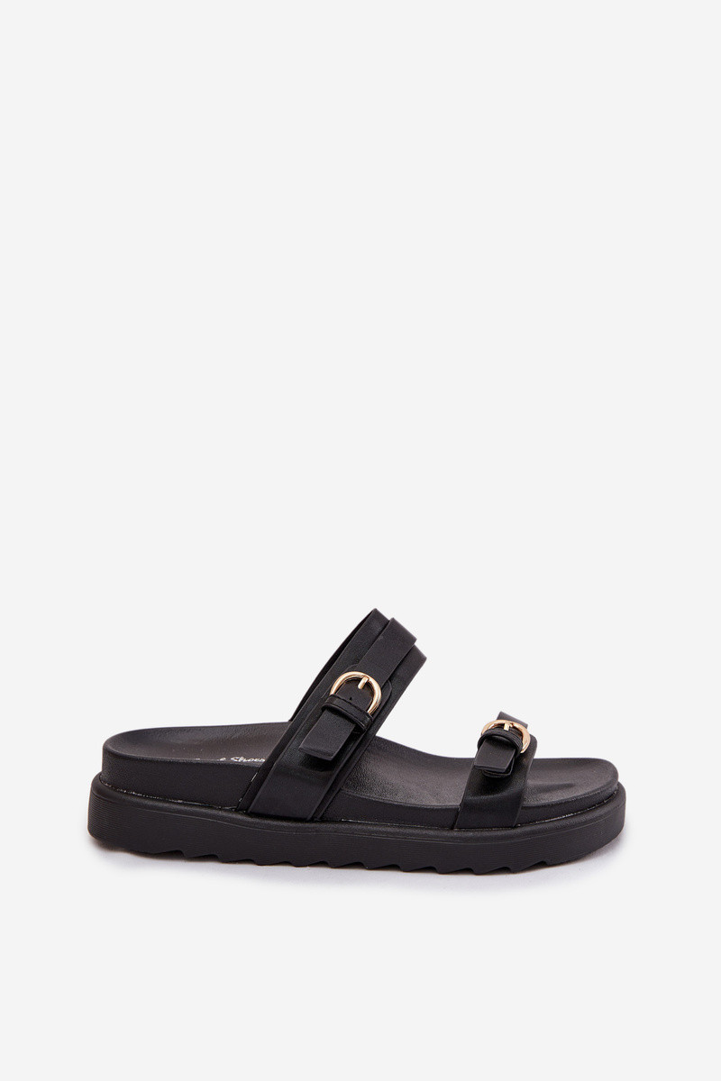 Pantoufles pour femmes avec une plateforme avec des bandes I couleur doréemi avec bouclesmi couleur noire Rirea