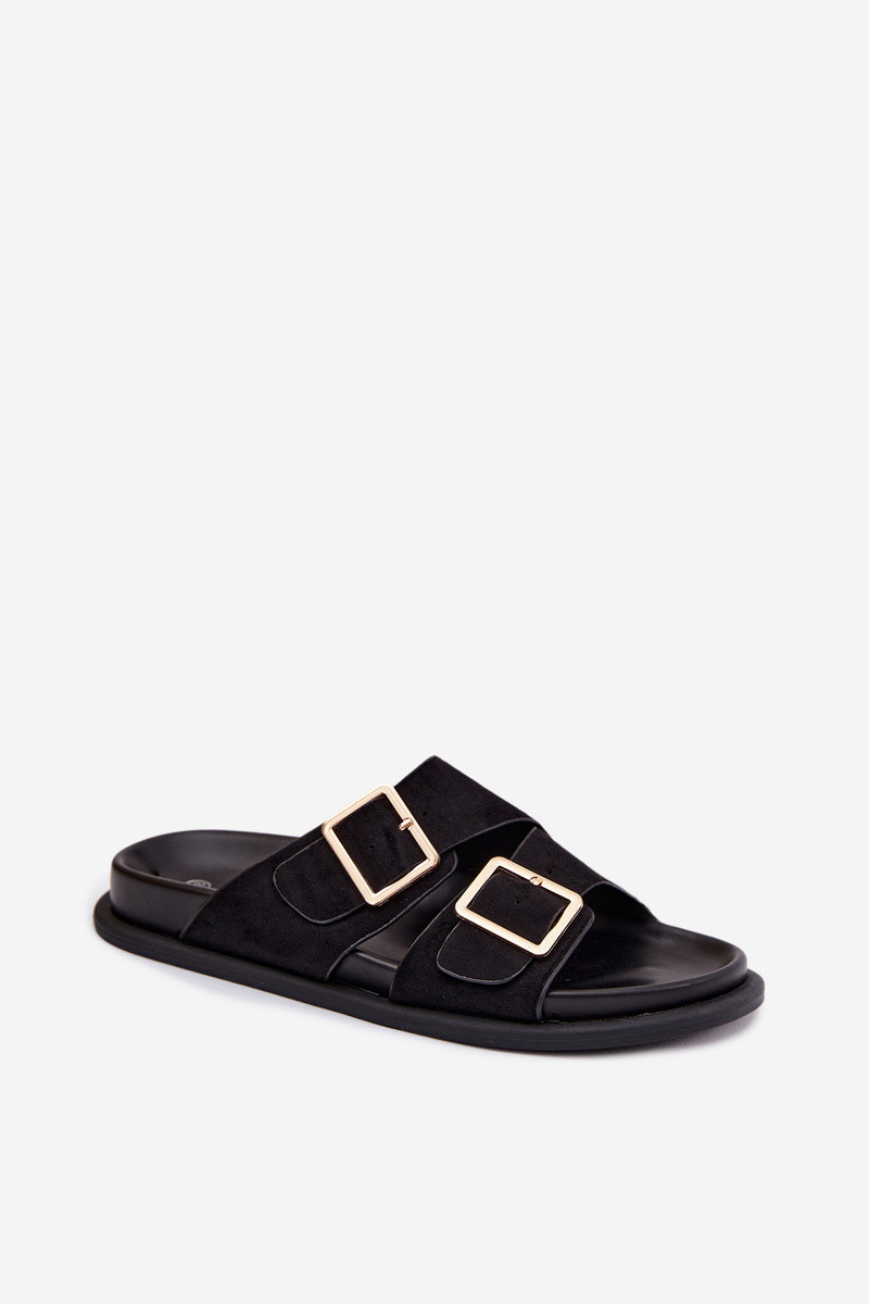 Pantoufles pour femmesImitacji en daimu couleur dorée avec boucles couleur noire Selissea