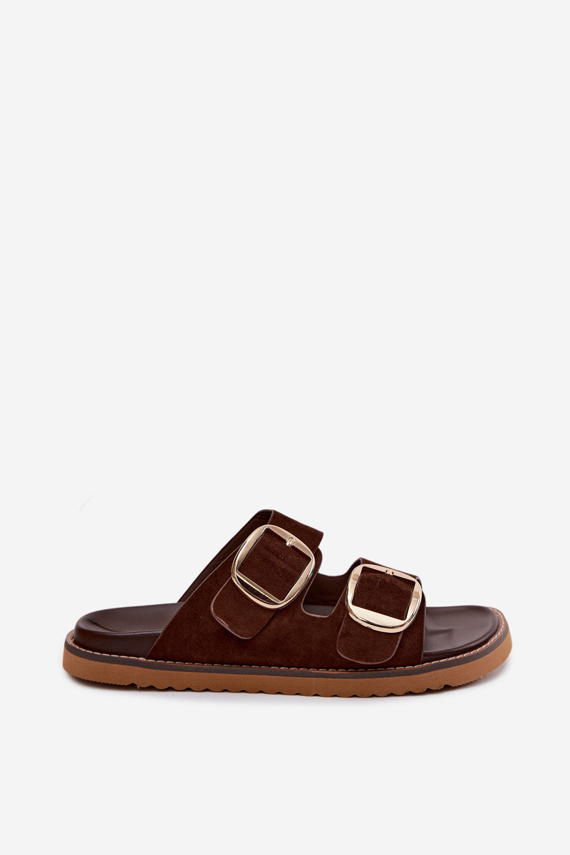 Pantoufles pour femmesImitacji en daimu couleur dorée avec boucles CzekoladoÀe Averia